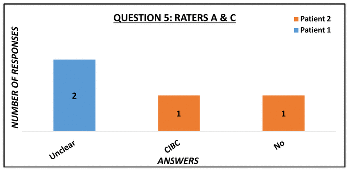 Figure 9 Participant answers to question 5 between raters A & CThe stacked bar chart shows each participant response to question 5, obtained during the decision-making capacity assessments done with the communication aid by raters A and C. | ||