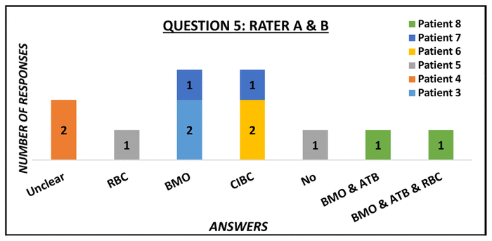 Figure 10 Participant answers to question 5 between raters A & BThe stacked bar chart shows each participant response to question 5, obtained during the decision-making capacity assessments done with the communication aid by raters A and B. | ||