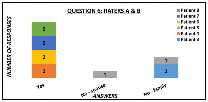 Figure 12 Participant answers to question 6 between raters A & BThe stacked bar chart shows each participant response to question 6, obtained during the decision-making capacity assessments done with the communication aid by raters A and B. | ||