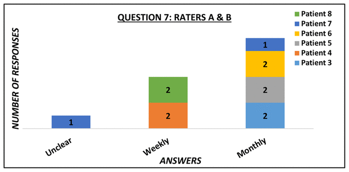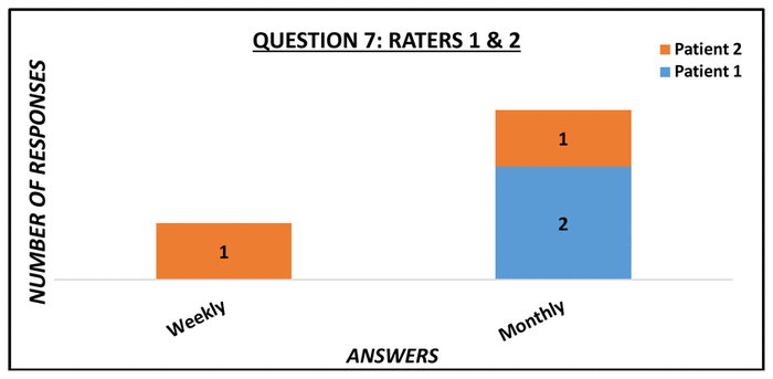 Figure 13 Participant answers to question 7 between raters 1 & 2The stacked bar chart shows each participant response to question 7, obtained during the decision-making capacity assessments done with the communication aid by raters A and C. | ||