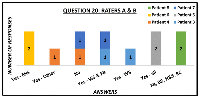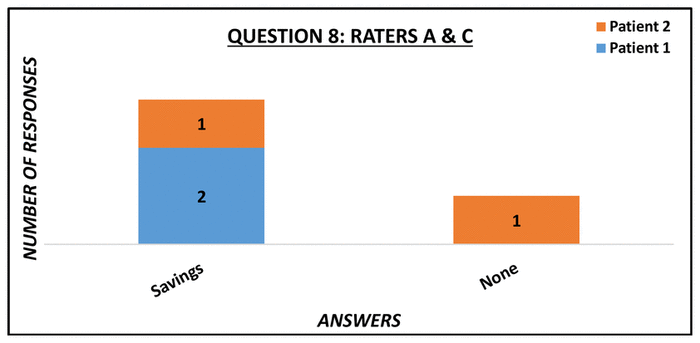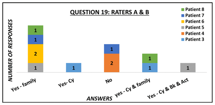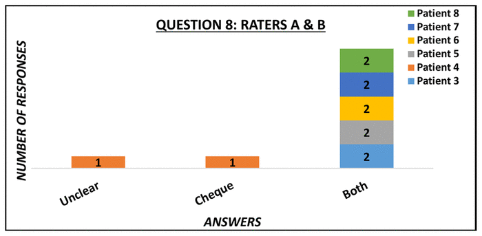 Figure 16 Participant answers to question 8 between raters A & BThe stacked bar chart shows each participant response to question 8, obtained during the decision-making capacity assessments done with the communication aid by raters A and B. | ||