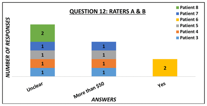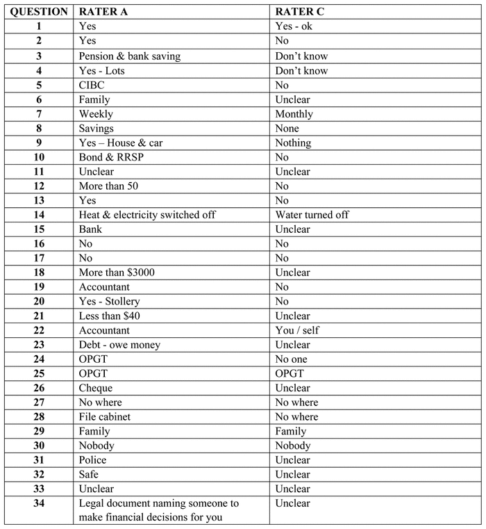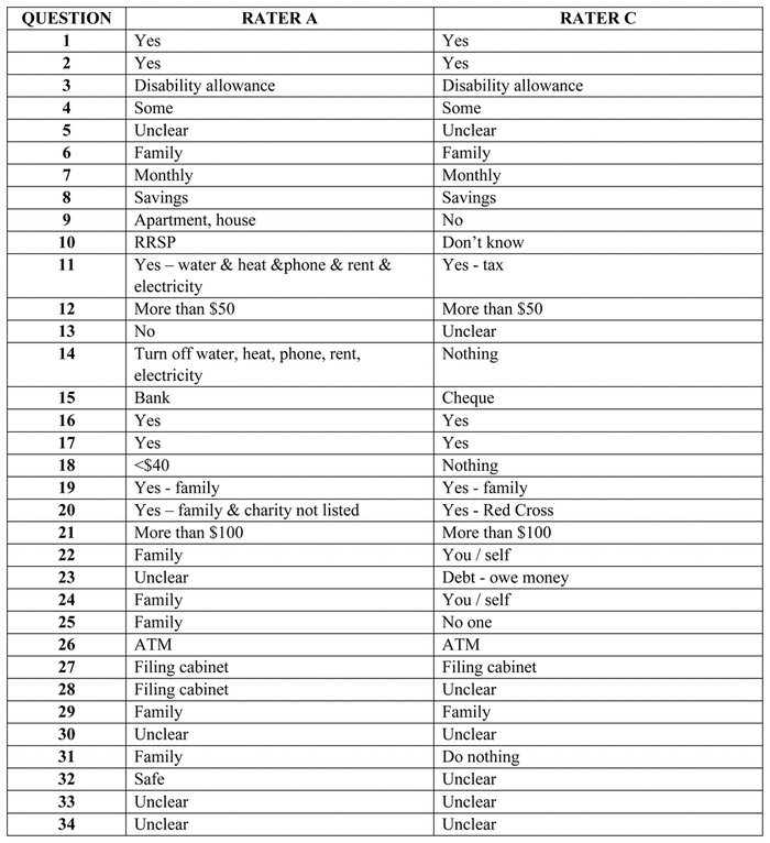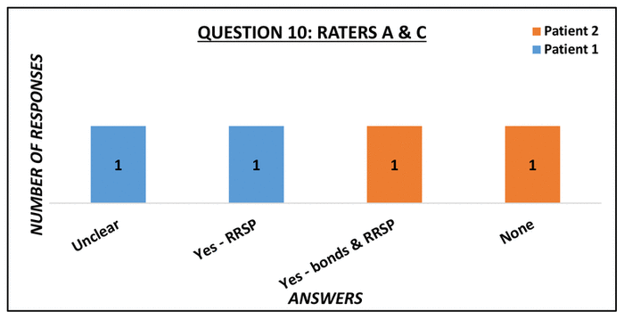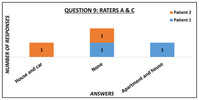 Figure 19 Participant answers to question 10 between raters A & CThe stacked bar chart shows each participant response to question 10, obtained during the decision-making capacity assessments done with the communication aid by raters A and C. Abbreviations: RRSP – registered retirement savings plan. | ||