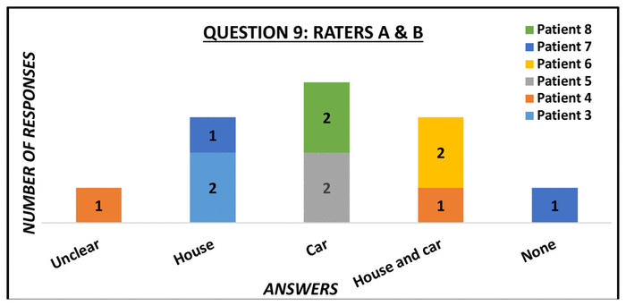 Figure 18 Participant answers to question 9 between raters A & BThe stacked bar chart shows each participant response to question 9, obtained during the decision-making capacity assessments done with the communication aid by raters A and B. | ||