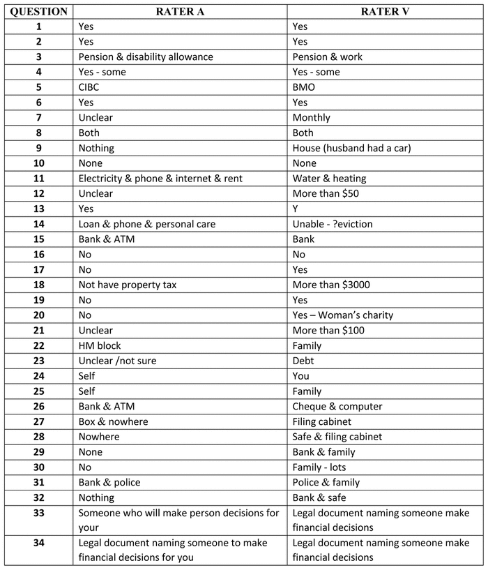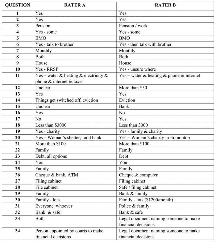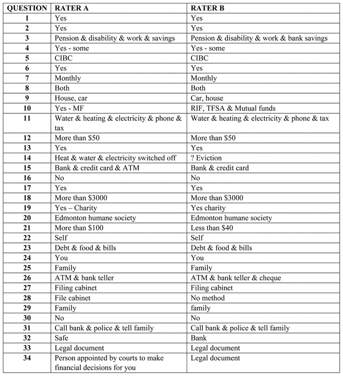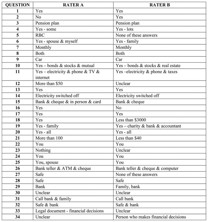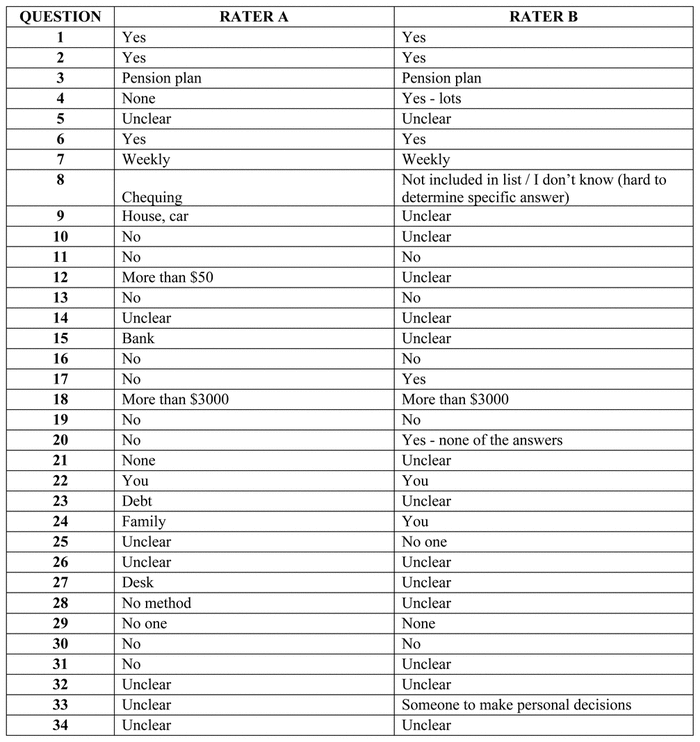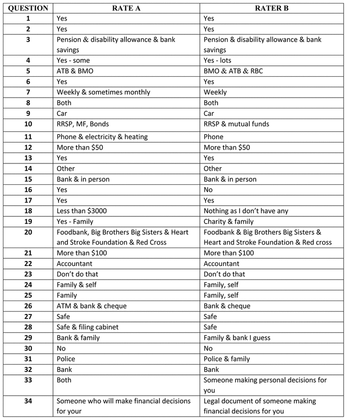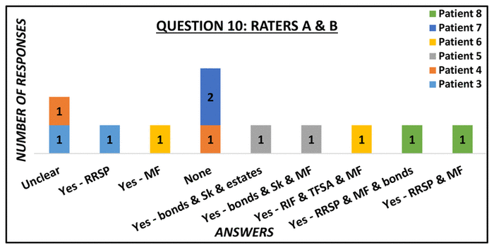 Figure 20 Participant answers to question 10 between raters A & BThe stacked bar chart shows each participant response to question 10, obtained during the decision-making capacity assessments done with the communication aid by raters A and B. Abbreviations: RRSP – registered retirement savings plan; Sk – stocks; MF – mutual funds; RIF – retirement income fund; TFSA – tax free savings account. | ||