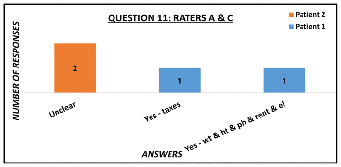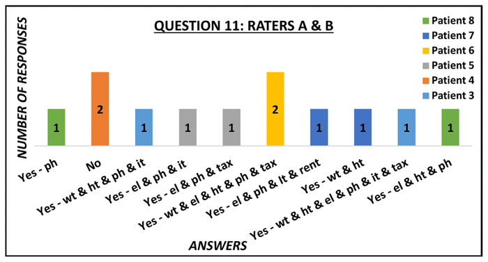 Figure 21 Participant answers to question 11 between raters A & CThe stacked bar chart shows each participant response to question 8, obtained during the decision-making capacity assessments done with the communication aid by raters A and C. Abbreviations: wt - water; ht - heat; ph - phone; el - electricity. | ||