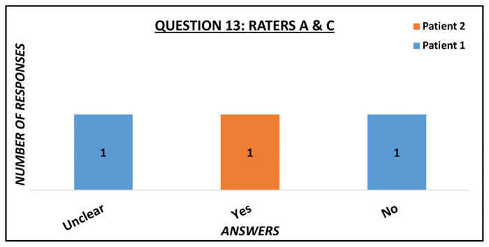 Figure 25 Participant answers to question 13 between raters A & CThe stacked bar chart shows each participant response to question 13, obtained during the decision-making capacity assessments done with the communication aid by raters A and C. | ||