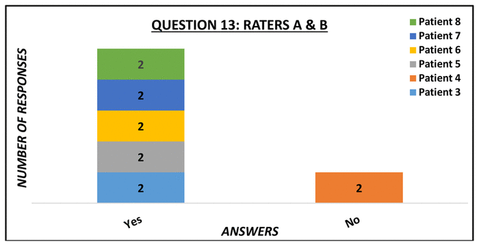 Figure 26 Participant answers to question 13 between raters A & BThe stacked bar chart shows each participant response to question 13, obtained during the decision-making capacity assessments done with the communication aid by raters A and B. | ||