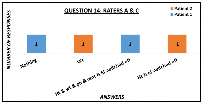 Figure 27 Participant answers to question 14 between raters A & CThe stacked bar chart shows each participant response to question 14, obtained during the decision-making capacity assessments done with the communication aid by raters A and C. Abbreviations: Wt - water; ht - heat, ph - phone, el - electricity. | ||