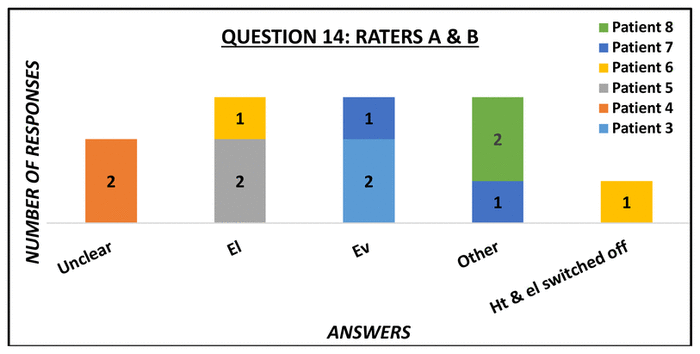 Figure 28 Participant answers to question 14 between raters A & BThe stacked bar chart shows each participant response to question 8, obtained during the decision-making capacity assessments done with the communication aid by raters A and B. Abbreviations: ht -heat; el – electricity; ev – eviction. | ||
