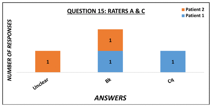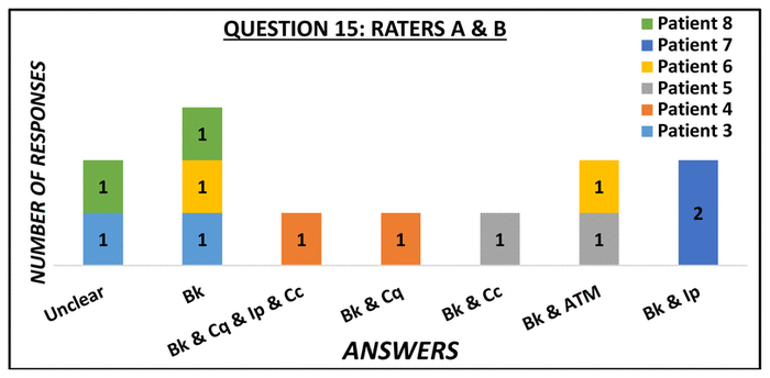 Figure 29 Participant answers to question 15 between raters A & CThe stacked bar chart shows each participant response to question 15, obtained during the decision-making capacity assessments done with the communication aid by raters A and C. Abbreviations: Bk – bank; Cq – cheque. | ||