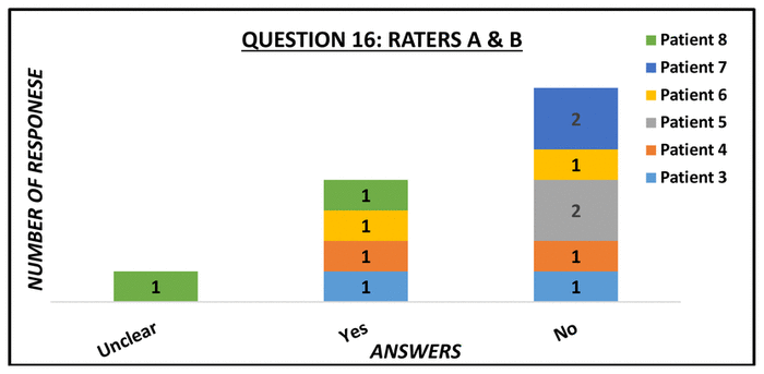 Figure 32 Participant answers to question 16 between raters A & BThe stacked bar chart shows each participant response to question 16, obtained during the decision-making capacity assessments done with the communication aid by raters A and B. | ||