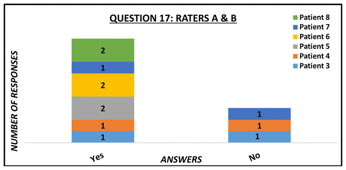 Figure 34 Participant answers to question 17 between raters A & BThe stacked bar chart shows each participant response to question 17, obtained during the decision-making capacity assessments done with the communication aid by raters A and B. | ||