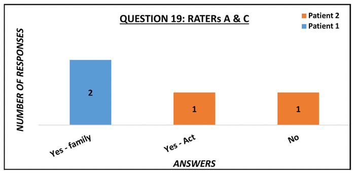 Figure 37 Participant answers to question 19 between raters A & CThe stacked bar chart shows each participant response to question 19, obtained during the decision-making capacity assessments done with the communication aid by raters A and C. Abbreviations: Act – accountant. | ||