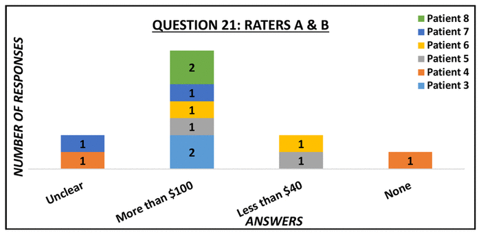 Figure 42 Participant answers to question 21 between raters A & BThe stacked bar chart shows each participant response to question 21, obtained during the decision-making capacity assessments done with the communication aid by raters A and B. | ||
