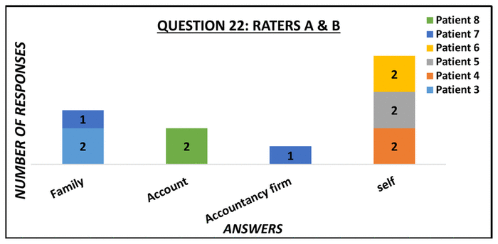 Figure 44 Participant answers to question 22 between raters A & BThe stacked bar chart shows each participant response to question 22, obtained during the decision-making capacity assessments done with the communication aid by raters A and B. | ||