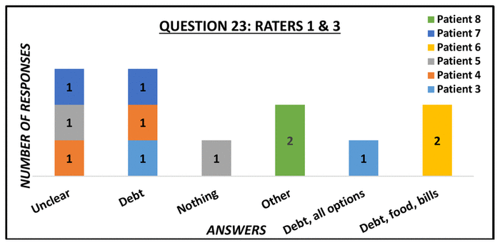 Figure 46 Participant answers to question 23 between raters A & BThe stacked bar chart shows each participant response to question 23, obtained during the decision-making capacity assessments done with the communication aid by raters A and B. | ||