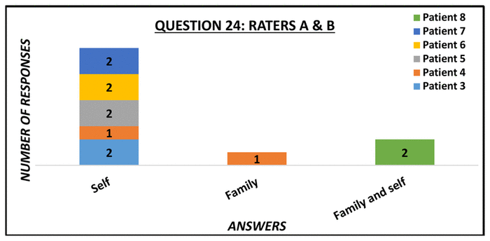 Figure 48 Participant answers to question 24 between raters A & BThe stacked bar chart shows each participant response to question 24, obtained during the decision-making capacity assessments done with the communication aid by raters A and B. | ||