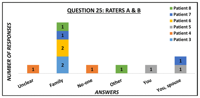 Figure 50 Participant answers to question 25 between raters A & BThe stacked bar chart shows each participant response to question 25, obtained during the decision-making capacity assessments done with the communication aid by raters A and B. | ||