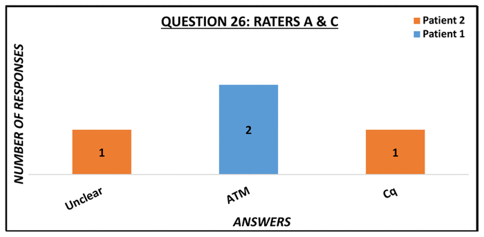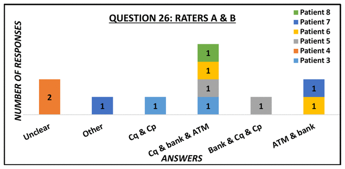 Figure 51 Participant answers to question 26 between raters A & CThe stacked bar chart shows each participant response to question 26, obtained during the decision-making capacity assessments done with the communication aid by raters A and C. Abbreviations: Cq – cheque. | ||