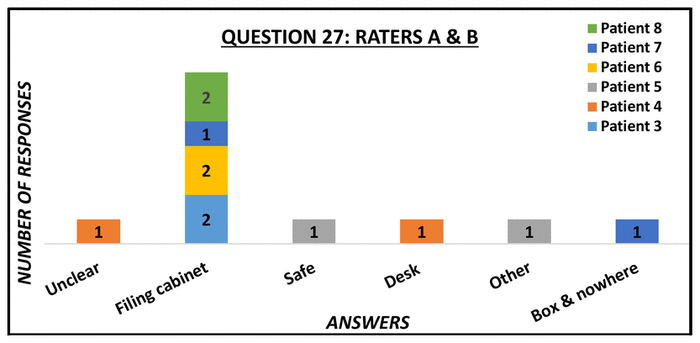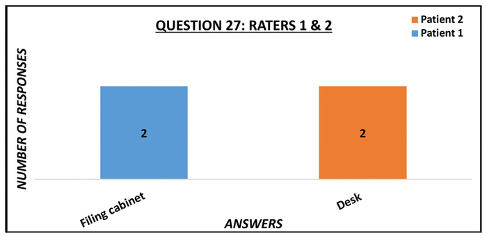 Figure 54 Participant answers to question 27 between raters A & BThe stacked bar chart shows each participant response to question 27, obtained during the decision-making capacity assessments done with the communication aid by raters A and B. | ||