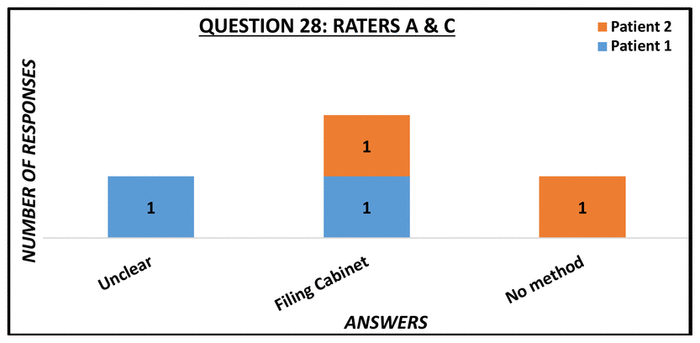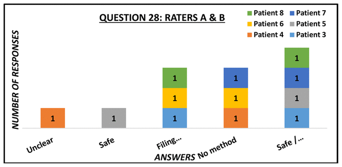 Figure 56 Participant answers to question 28 between raters A & BThe stacked bar chart shows each participant response to question 28, obtained during the decision-making capacity assessments done with the communication aid by raters A and B. | ||