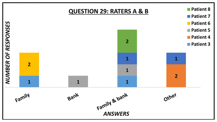 Figure 58 Participant answers to question 29 between raters A & BThe stacked bar chart shows each participant response to question 29, obtained during the decision-making capacity assessments done with the communication aid by raters A and B. | ||