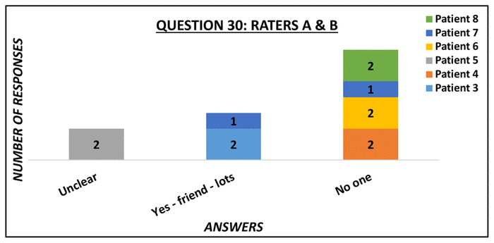 Figure 60 Participant answers to question 30 between raters A & BThe stacked bar chart shows each participant response to question 30, obtained during the decision-making capacity assessments done with the communication aid by raters A and B. | ||