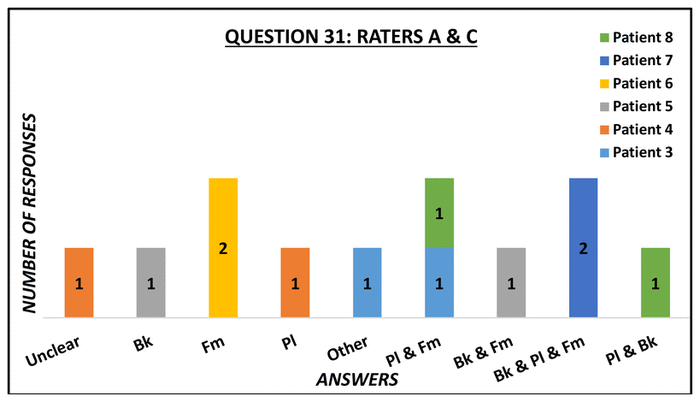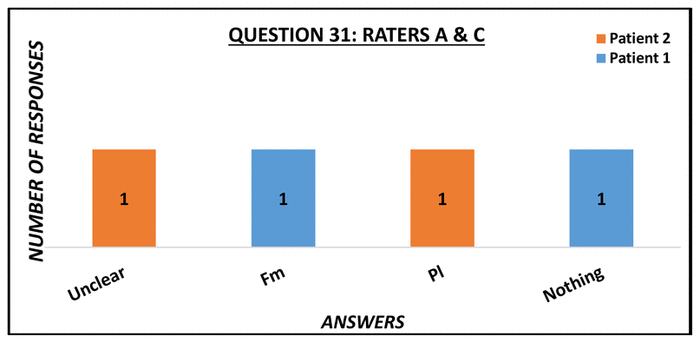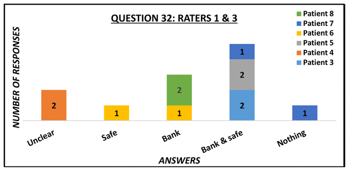 Figure 61 Participant answers to question 31 between raters A & CThe stacked bar chart shows each participant response to question 31, obtained during the decision-making capacity assessments done with the communication aid by raters A and C. Abbreviations: Fm – family; Pl – police; Bk – bank. | ||