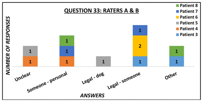 Figure 66 Participant answers to question 33 between raters A & BThe stacked bar chart shows each participant response to question 33, obtained during the decision-making capacity assessments done with the communication aid by raters A and B. | ||