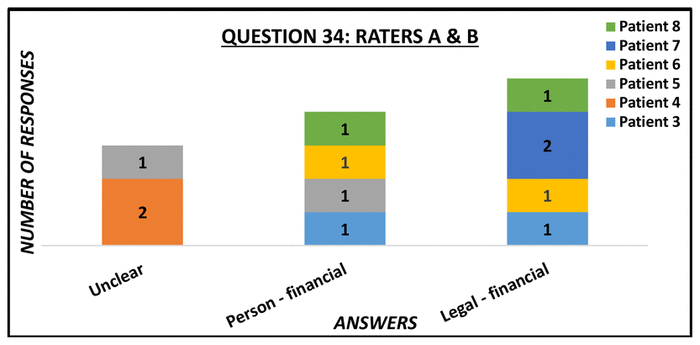 Figure 68 Participant answers to question 34 between raters A & BThe stacked bar chart shows each participant response to question 34, obtained during the decision-making capacity assessments done with the communication aid by raters A and B. | ||