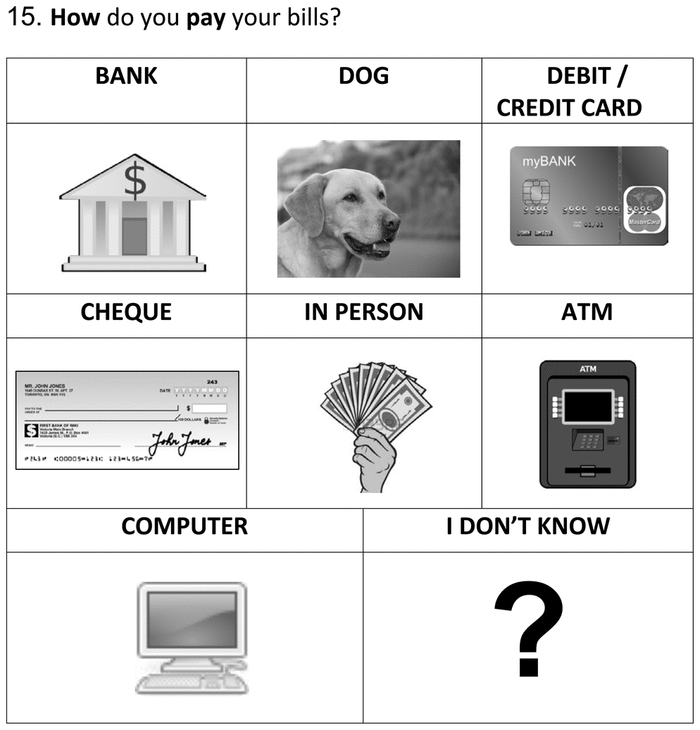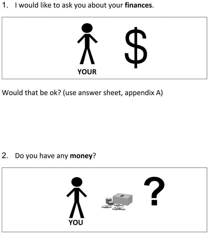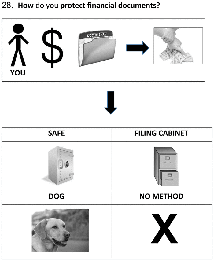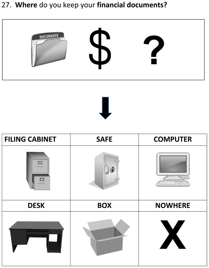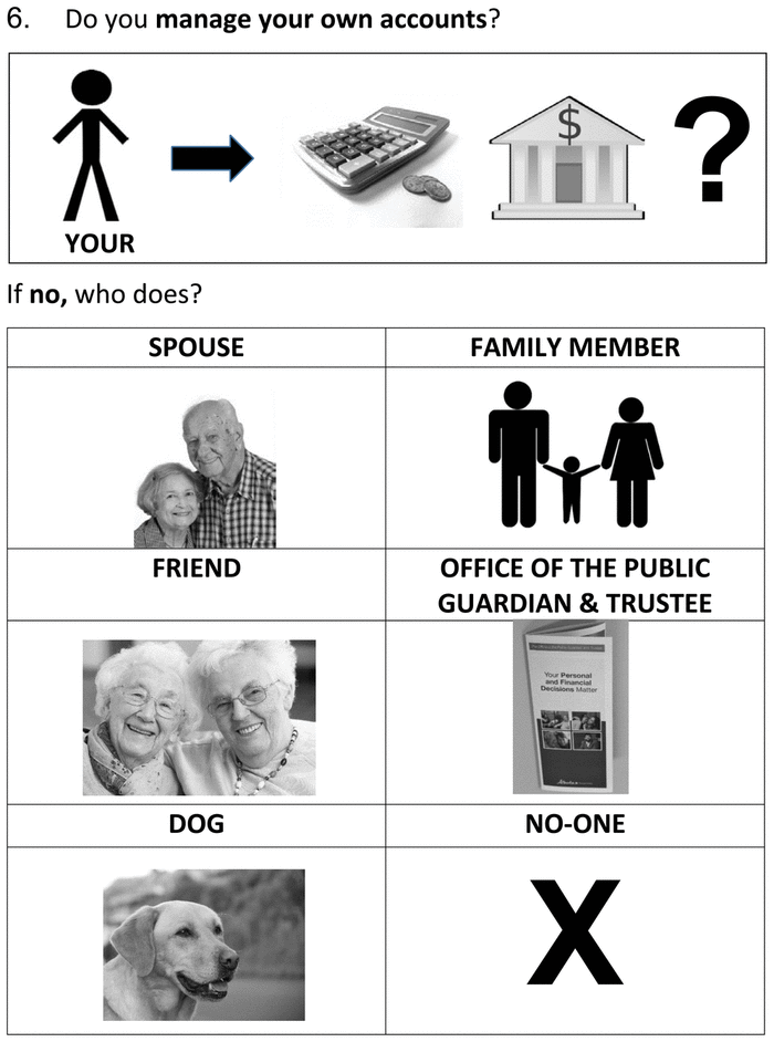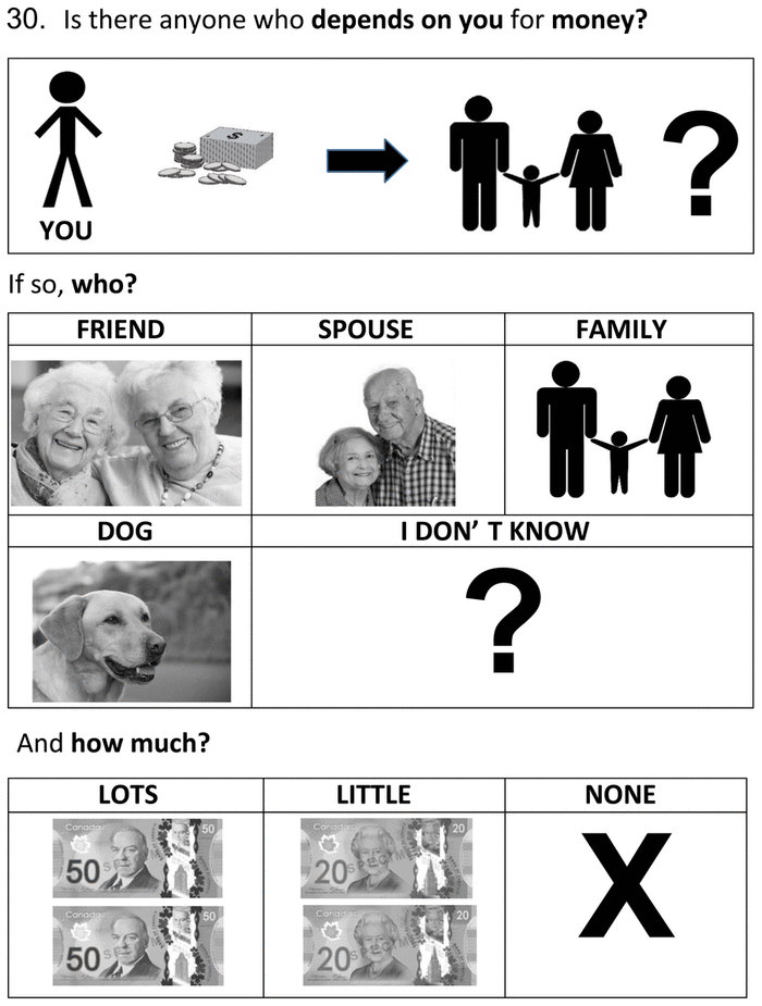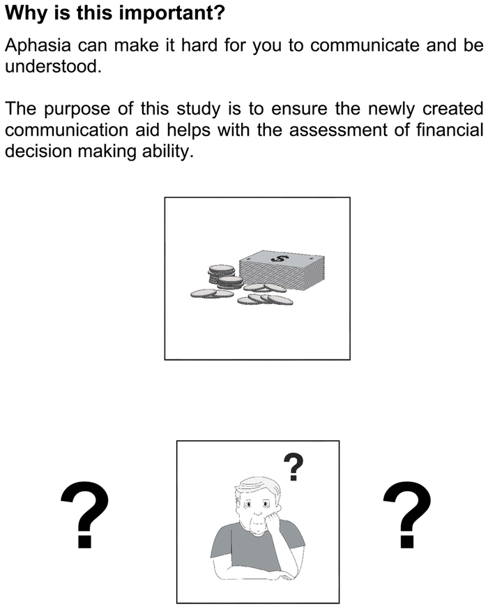 This visual communication capacity aid has been designed and validated to assist with the evaluation of financial decision making capacity specifically for individuals with post stroke (expressive) aphasia. It should not be used to assist with capacity assessments for other domains or individuals without aphasia. The target population in which this communication aid has been validated are individuals over the age of 65 who have been diagnosed with post-stroke expressive aphasia and are native english speakers. Using this communication aid in other populations or outside its recommended use will limit the accuracy (and may invalidate) the results obtained, in addition to violating individual copyright use of the instrument.