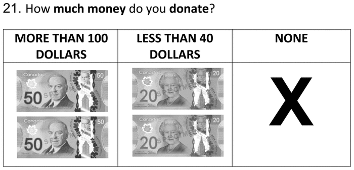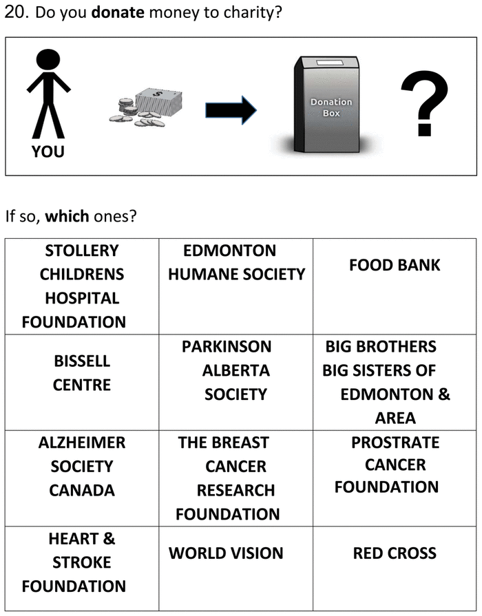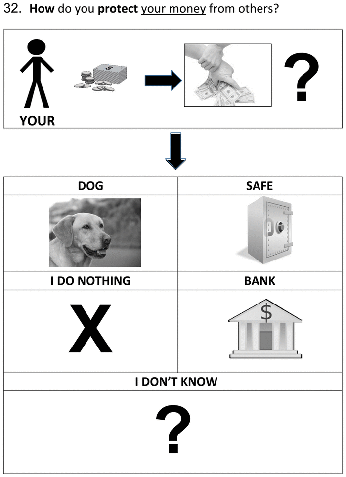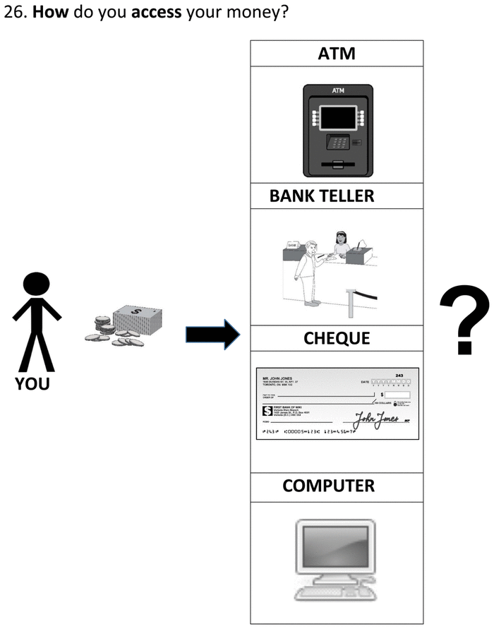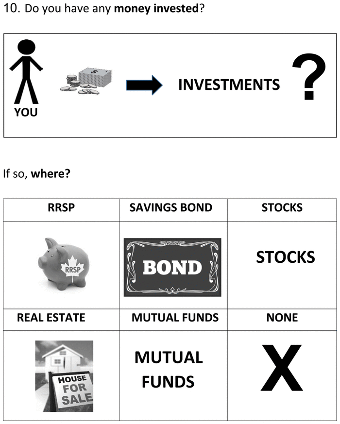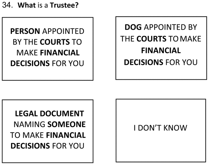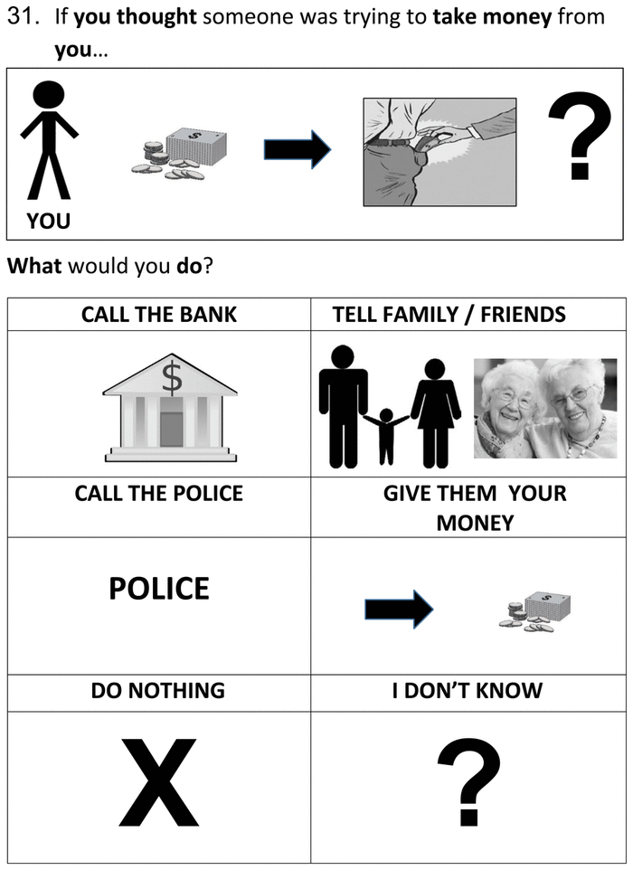 This visual communication capacity aid has been designed and validated to assist with the evaluation of financial decision making capacity specifically for individuals with post stroke (expressive) aphasia. It should not be used to assist with capacity assessments for other domains or individuals without aphasia. The target population in which this communication aid has been validated are individuals over the age of 65 who have been diagnosed with post-stroke expressive aphasia and are native english speakers. Using this communication aid in other populations or outside its recommended use will limit the accuracy (and may invalidate) the results obtained, in addition to violating individual copyright use of the instrument.
