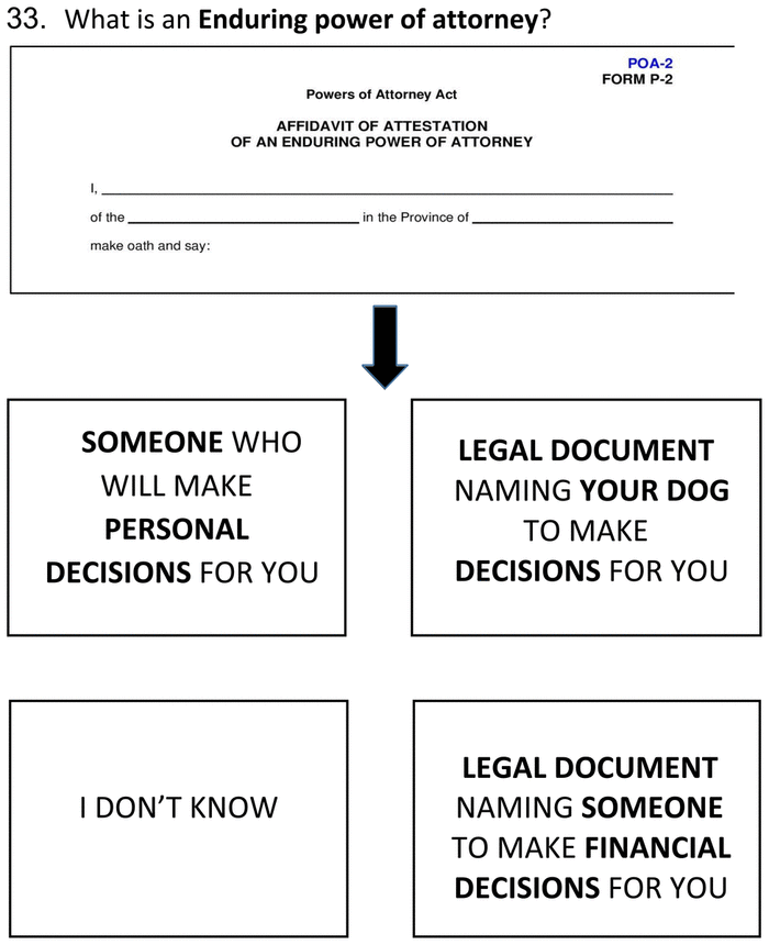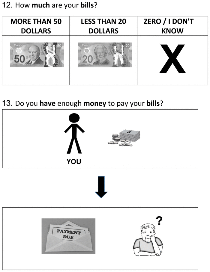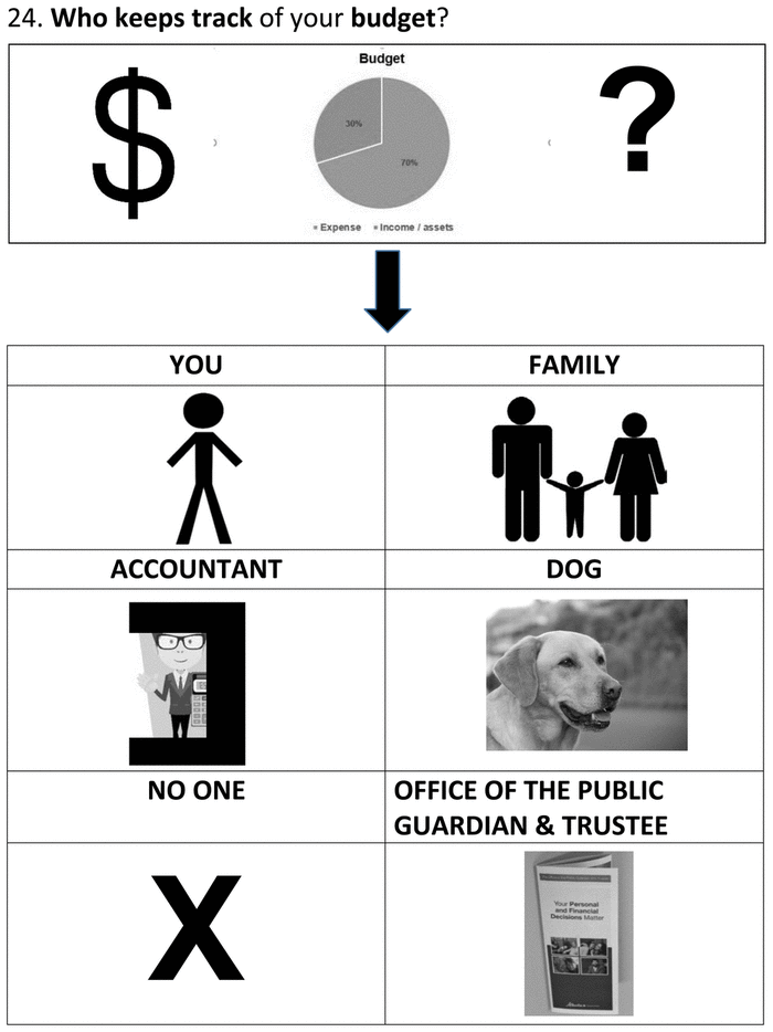 Communication aids should be used to support all DMCAs in PWA. However, only one communication aid exists, which is designed only to support assessments of personal DMC for accommodation decisions. No communication aids exists to support DMCAs for either legal and/or financial DMC.(1) Therefore, the primary objectives for this study were to develop and establish the psychometric properties of a new communication aid to assist with financial DMCAs for PWA.