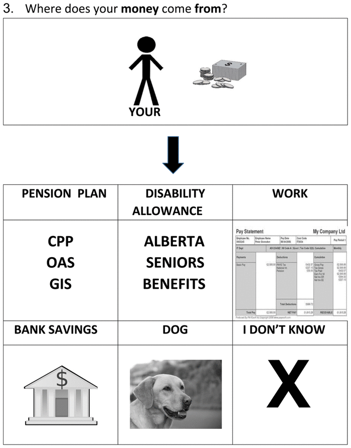 The first phase involved exploring community-dwelling older adults’ (65 years or older) current understanding of general and specific (financial and legal) DMC, and about communication and communication disorders, using focus groups the number of which was determine by data theme saturation. Focus group participants were recruited from local community centres and two of the local hospital volunteer programs (University of Alberta (UAH) and Glenrose Rehabilitation Hospital (GRH)) using a purposeful sampling technique. Focus group discussions were recorded, and transcribed by an independent party, with personally identifying information being removed during this process. Transcribed data were thematically analyzed using NVIVO software (Version 12) (QSR International, Burlington, MA). The generated themes were used to inform and guide the development of the new visual communication capacity aid.