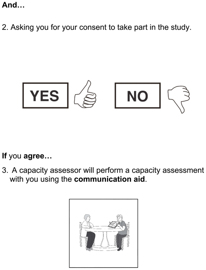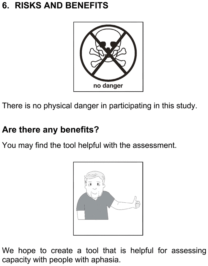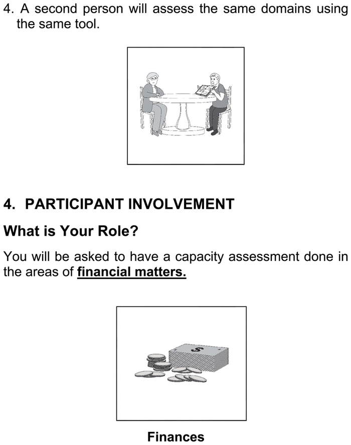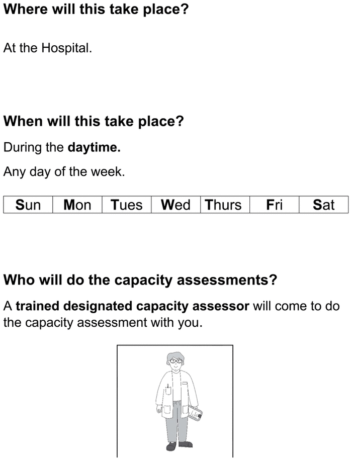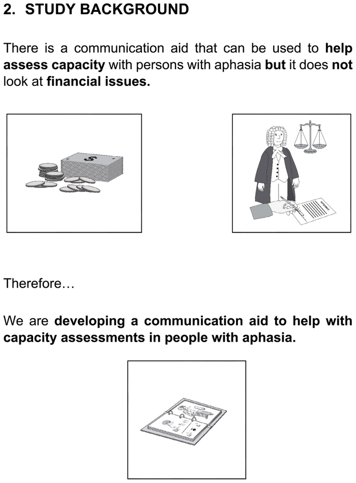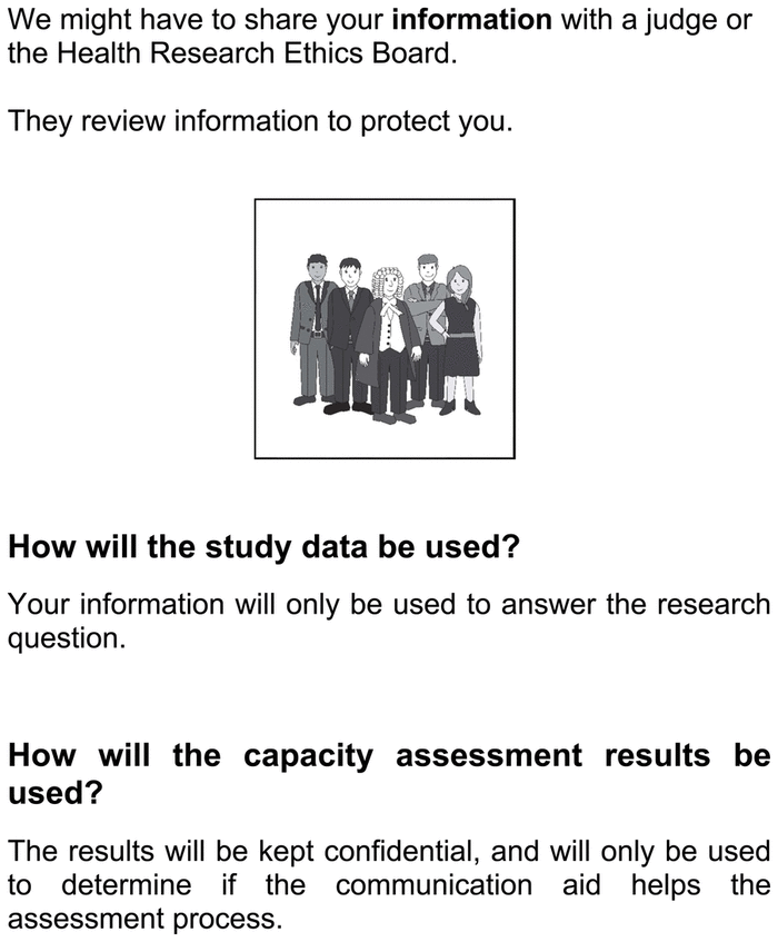 Content for the communication aid was obtained using a triangulation of data sources, which included focus group feedback, purchased images, speech-language pathologist (SLP) feedback, and content from the Capacity Interview Worksheets.(3) Common themes from the focus group feedback where identified and transformed into pictographic representation for each question in the communication aid. Potential copyright issues were discussed with a copyright lawyer. Each draft of the communication aid was presented to the research team and revised accordingly until consensus was reached on the appearance and content of the communication aid. Please refer to Appendix A for a copy of the communication aid.