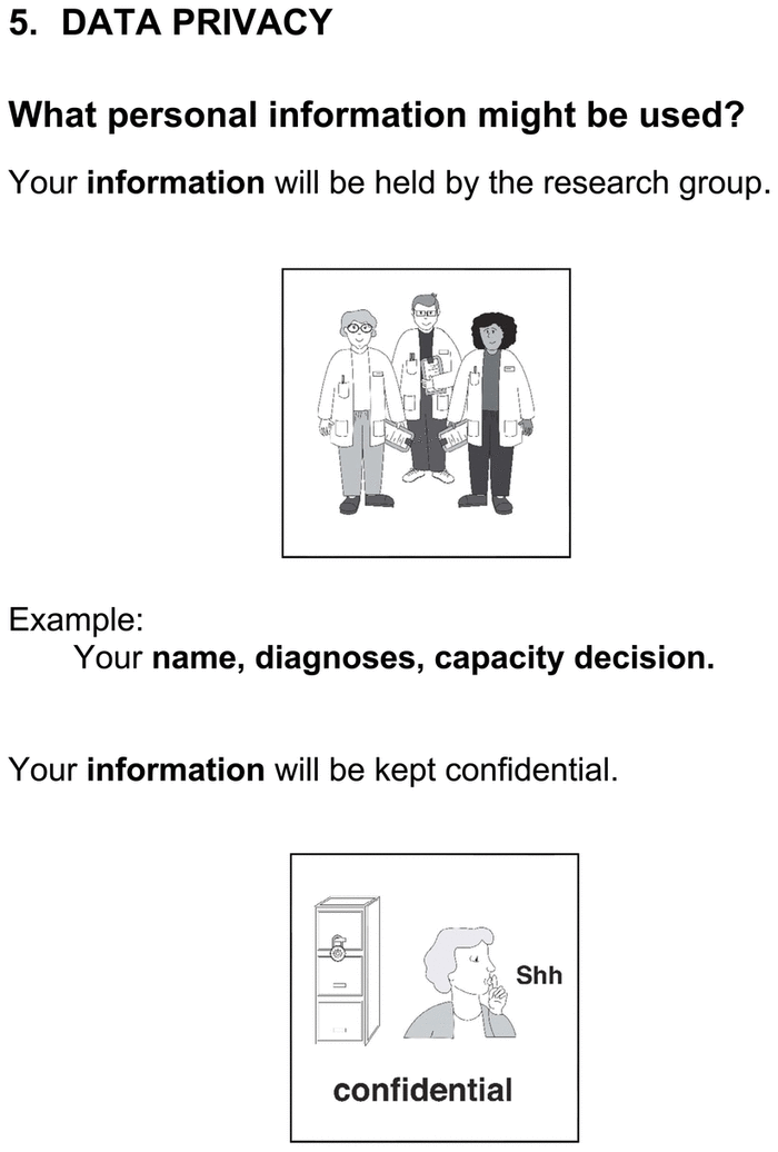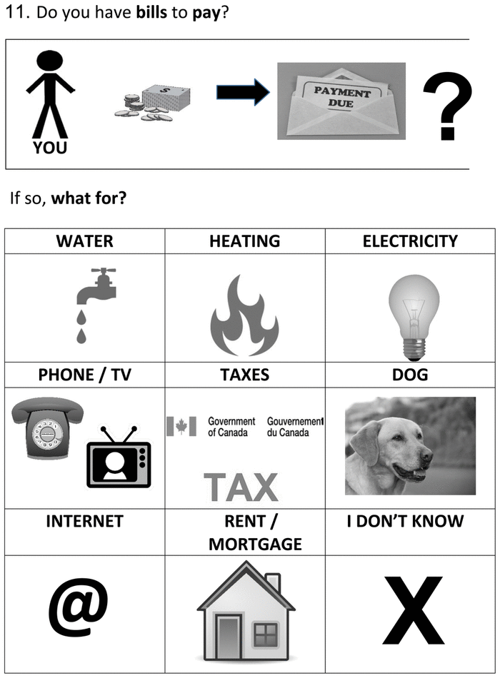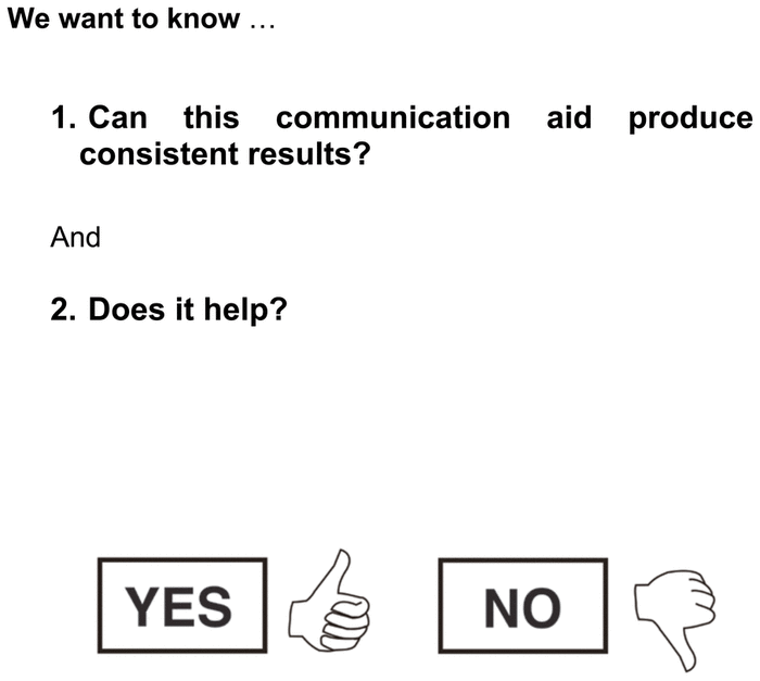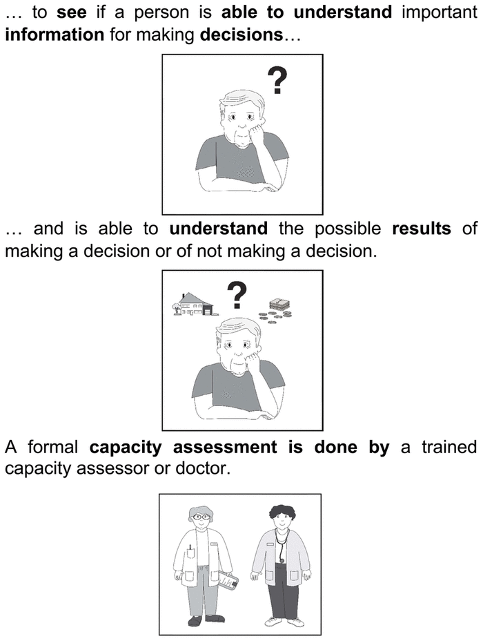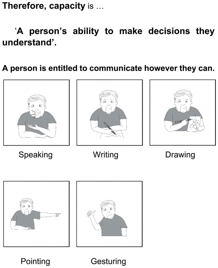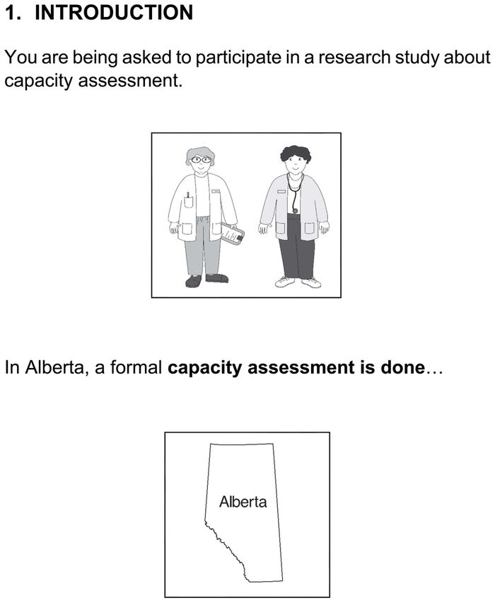 Content for the communication aid was obtained using a triangulation of data sources, which included focus group feedback, purchased images, speech-language pathologist (SLP) feedback, and content from the Capacity Interview Worksheets.(3) Common themes from the focus group feedback where identified and transformed into pictographic representation for each question in the communication aid. Potential copyright issues were discussed with a copyright lawyer. Each draft of the communication aid was presented to the research team and revised accordingly until consensus was reached on the appearance and content of the communication aid. Please refer to Appendix A for a copy of the communication aid.