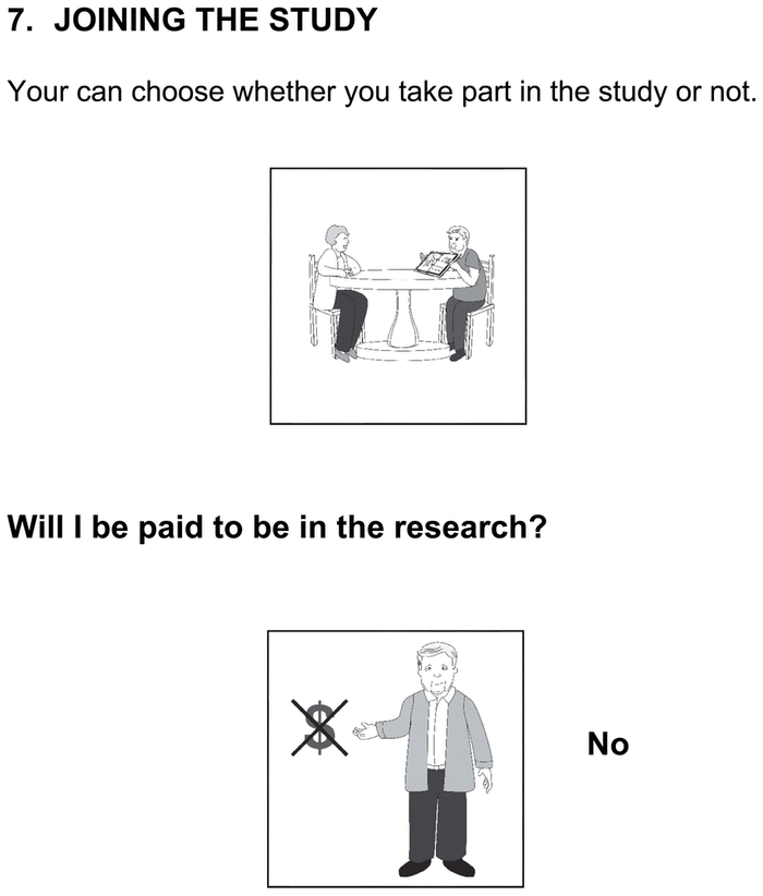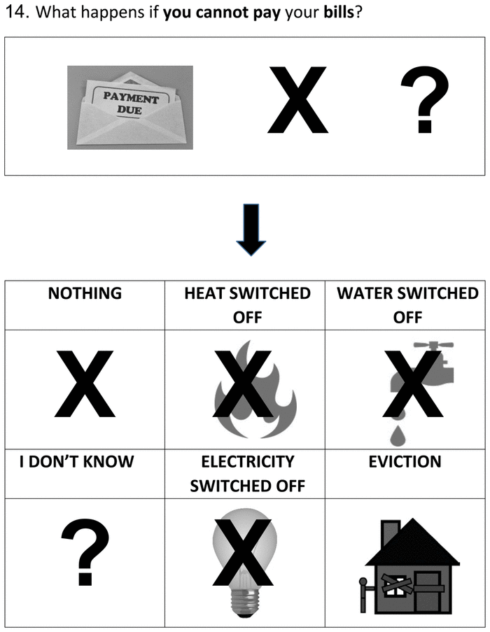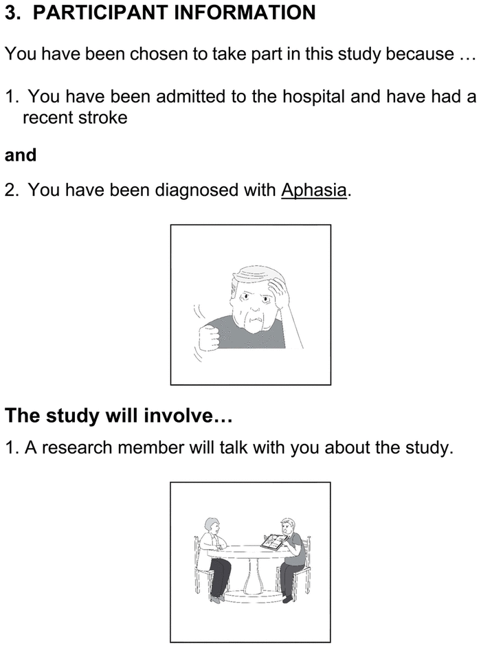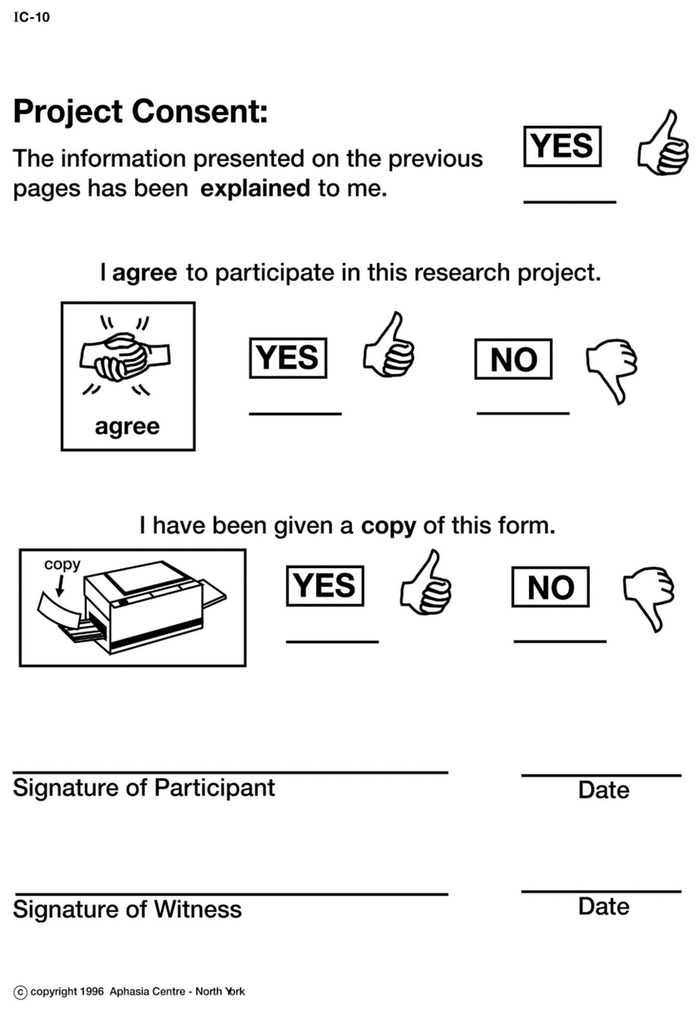 The new communication aid is a 37-page paper-based document comprised of 34 picture-based questions (containing black-and-white pictures), along with a set of user instructions that details the additional equipment required, and an appendix listing the image sources (Appendix A). Although the initial plan had been to use color images, due to concerns about degradation and reproducibility of images, black-and-white images were used instead. In addition, a unique ‘Aphasia Friendly Participant Consent Form’ was also developed, using a similar format (Appendix B). This is a 22-page paper consent form that covers all the necessary aspects required for obtaining consent, using a variety of picture-based questions.