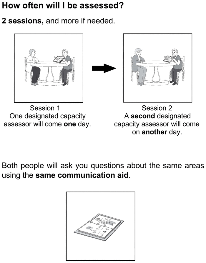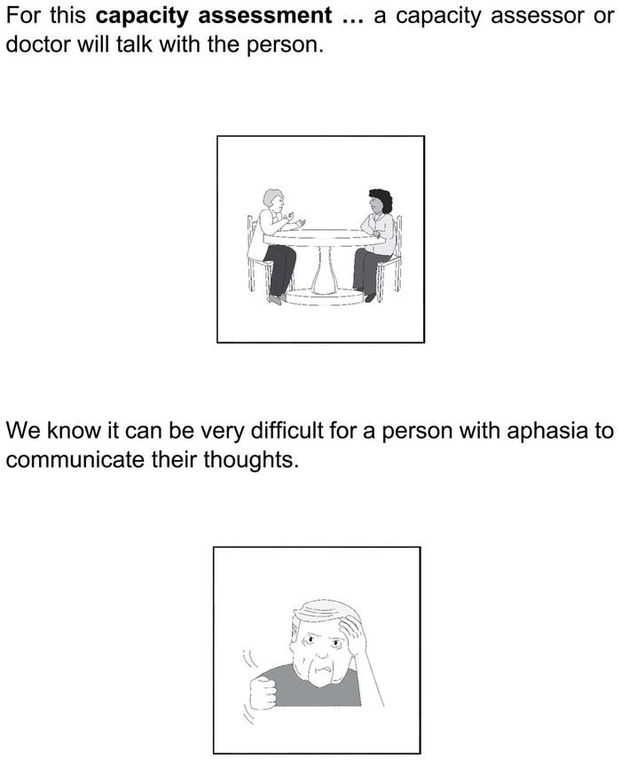 All potential users of this communication capacity aid should have the necessary training required to conduct capacity assessments either by nature of their qualifications (physicians, surgeons and psychologists) or have undergo specialized training to become a designated capacity assessor (DCA). In addition, all users are required to have undergone training in the use of Supported Conversation for Adults with Aphasia’ which is available online at http://www.aphasia.ca/home-page/health-care-professionals/knowledge-exchange/ and provides information regarding the appropriate use of communication techniques to use when working with aphasic individuals. There are no recommended time constraints for using the visual communication aid, as the amount of time required will depend on individual needs.