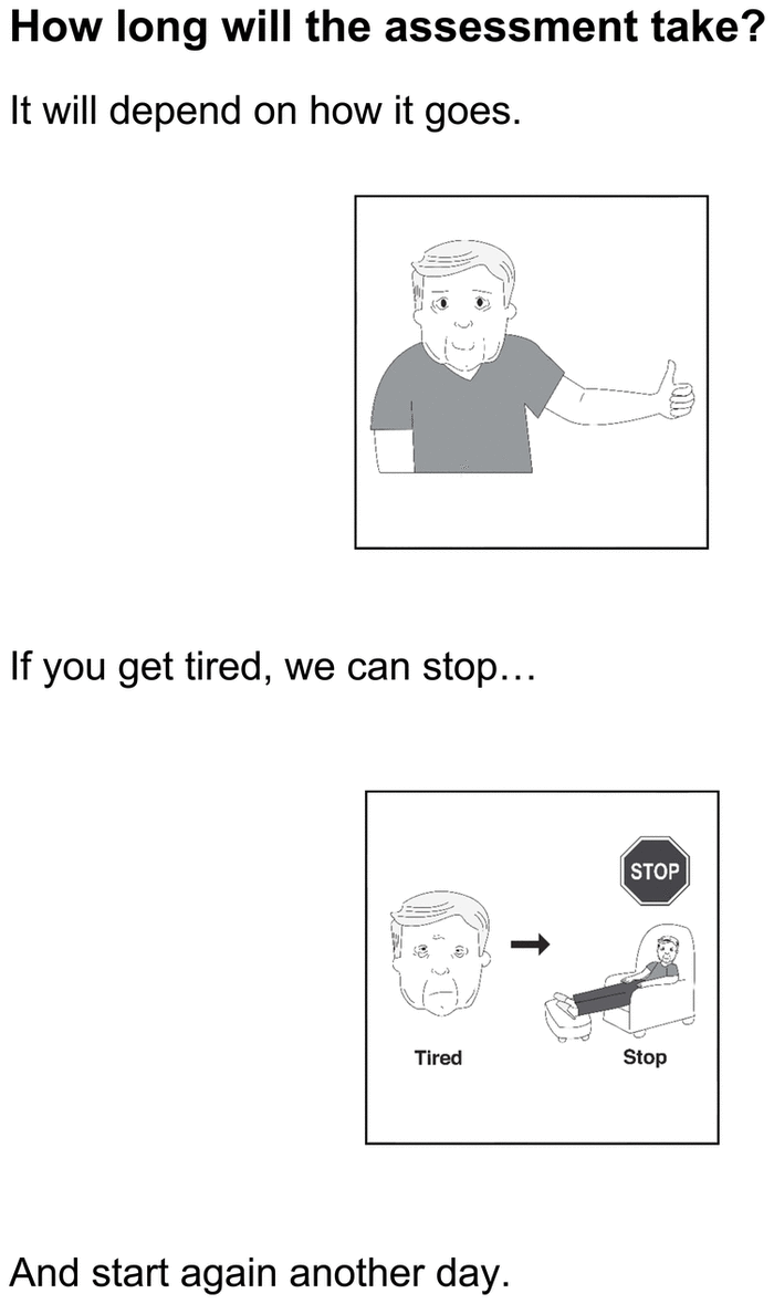Given the comprehensive nature of the communication capacity aid, only small pictures could be accommodated within its scope. Should visual access be an issue, then it is recommended that larger versions of the pictures included in the aid be used for the assessment.
