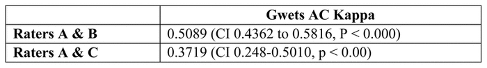 Group two had two participants, resulting in four assessments and a total of 136 observations (see Tables E7 & E8 in Appendix E). Gwen’s kappa of 0.3719 (CI 0.248–0.5010, p < .00) (see Table F1 of Appendix F).