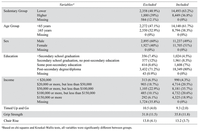 Only participants with complete data were used to analyze prevalence estimates and associations of sedentary time with each outcome variable. Participants without follow-up data were removed (n= 2,333), as were those with missing sedentary time (n= 584), age and sex (n=1), timed up and go time (n=310), grip strength (n=1,831), chair rise time (n=613), education (n=38), and household income (n=1,446). This resulted in a sample of 22,942 participants before removing participants with missing data on the outcome variables. Table 1 shows a comparison between included and excluded participants, with the latter being older and having lower functional fitness. Only participants with complete data were included in our models; this produced different sample sizes for the analysis of each fall and falls-related injuries.
