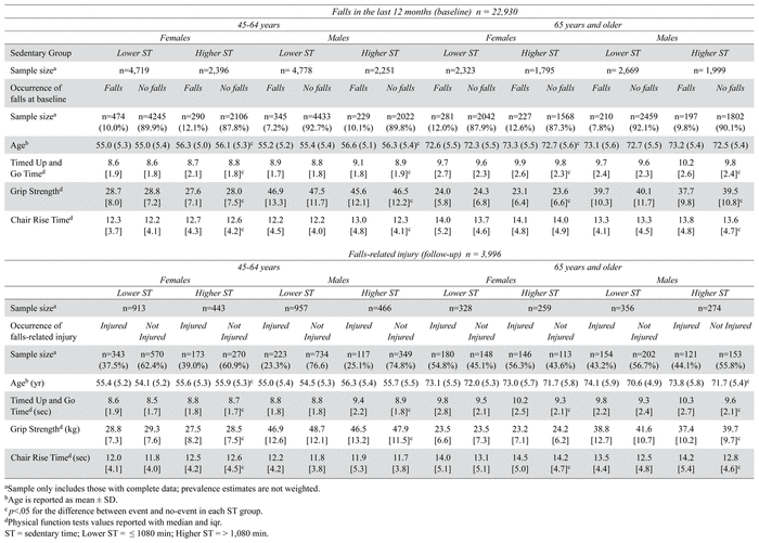 The sample sizes, mean age, and prevalence estimates stratified by sedentary group, age group, and sex are described in Table 2. Among females aged 65 and older in the higher sedentary group, 12.6% reported a fall at baseline. In contrast, only 10% of females aged 45–64 years who reported lower sedentary time reported a fall. Among women aged 65 and older who reported higher sedentary time, 56.3% reported an injury that was due to a fall; in contrast, only 44.1% of males over 65 years who reported higher sedentary time reported such a falls-related injury.