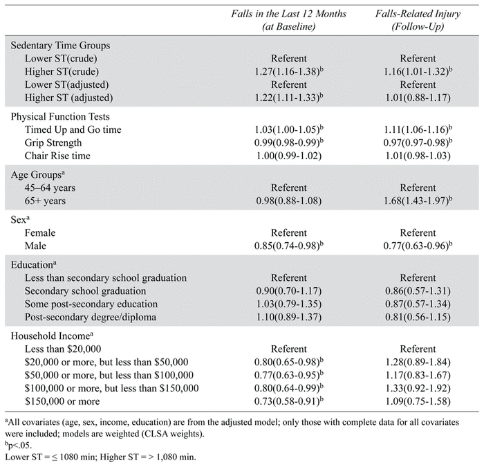 Descriptive analysis stratified by age category (middle-aged <65, older adult ≥65) and sex (males and females) were conducted to report the prevalence of falls and falls-related injuries. Logistic regression models were used to estimate the crude relationship between sedentary time at baseline to falls and falls-related injuries. The analysis was then adjusted for functional fitness scores and sociodemographic variables (age, sex, income, education). The analytic weights provided by CLSA were used in the logistic regression models. These weights were proportional to the inflation weights used to adjust for sample representation in CLSA, but rescaled to the sample size and provincial region where each Data Collection Site is located. All analyses were conducted in R version 4.0.3 (The R Foundation for Statistical Computing, https://www.r-project.org/foundation/) and RStudio version 1.3 1093 (RStudio, PCB; Boston, MA), and statistical significance was set at 0.05.