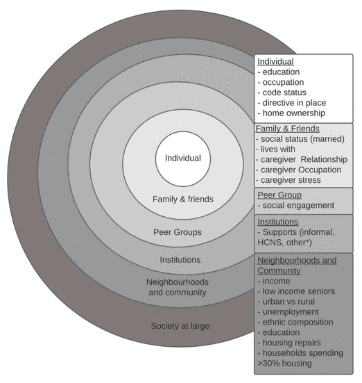 Building on the SVI described by Andrew and Keefe,(3) we included eight neighbourhood-level variables because an individual’s social vulnerability is directly influenced by their larger social networks, cultures, environments, and institutions.(3) An example of a neighbourhood variable is the unemployment rate of a dissemination area (DA) compared to the rest of the DAs in the province. DAs represent approximately 500 individuals and are the smallest standard geographic unit for census data. The 2016 Canadian Census was chosen as the best and most recent representation of this cohort’s living situation. We demonstrate the 20 SVI variables situated within an ecological framework in Figure 1.
