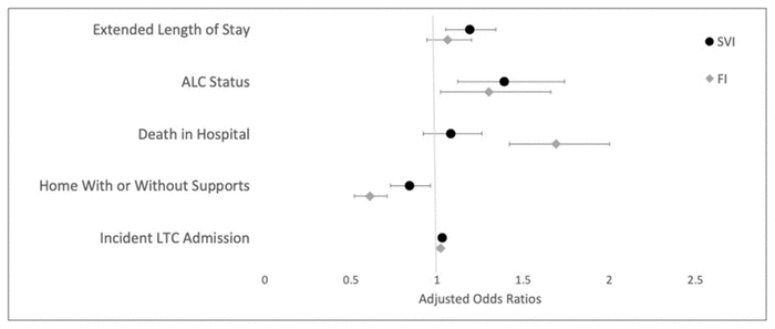 Figure 2 also summarizes the association between SVI, FI, and discharge destination. FI, but not SVI, was associated with a 70% increase in odds of dying in hospital (aOR 1.69, CI: 1.42, 2.00, p<.001). Among older adults who did not die in hospital, those with higher social vulnerability were less likely to return home (aOR 0.84, 95% CI 0.73, 0.96, p=.009). In a penalized regression model, SVI was also associated with greater odds of incident LTC home admission (aOR 1.03, CI: 1.02, 1.04, p<.001). Effect estimates, confidence intervals, and p values of all outcomes are available in Appendix C.