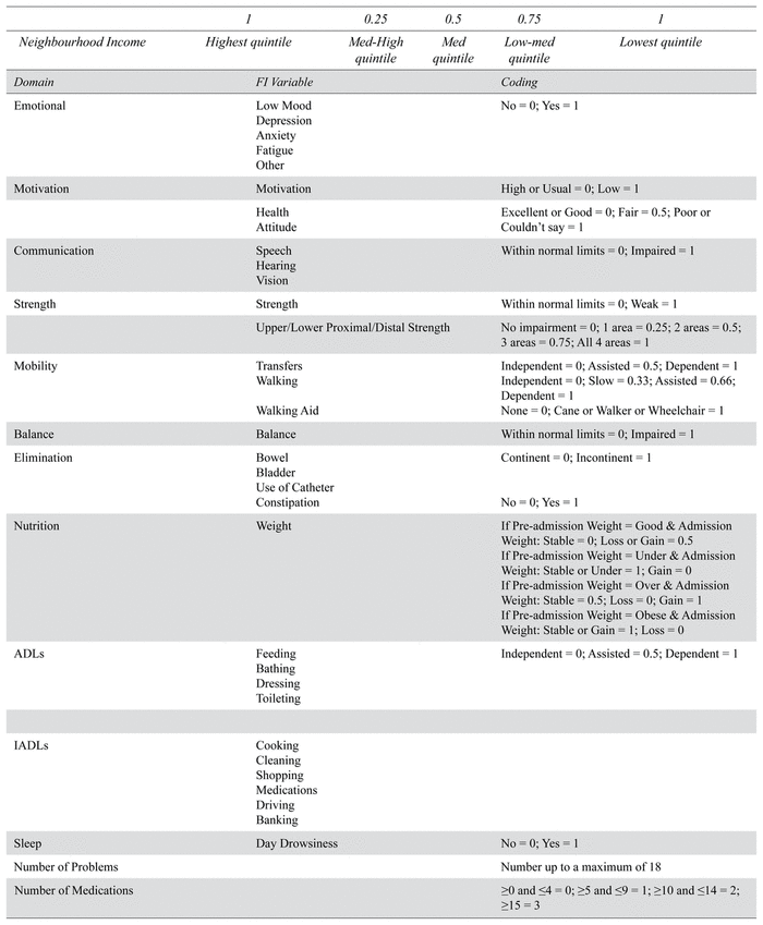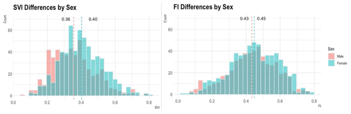 Frailty is measured as a 57-item frailty index (FI) using the same methods described above. The variables and coding of the FI is available in Appendix B and in previous publications.(11) The SVI and FI were multiplied by 10 before addition to the regression models, allowing us to interpret adjusted odds ratios (aORs) and LOS for each 0.1 increase in these indices.