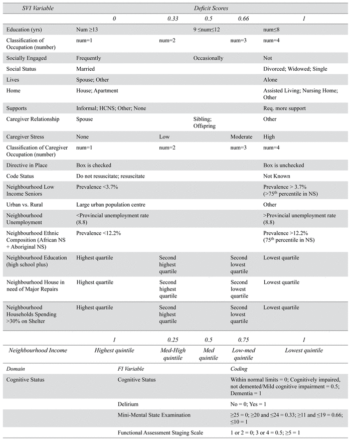 Each social deficit is coded between 0 and 1, with 1 indicating the greatest state of relative vulnerability (e.g., being married is coded 0 and single or widowed is coded 1). For intermediate responses, deficits may take a value of 0.5. Ordinal variables rank into a score according to number of levels. For example, a deficit with four levels would be coded 0 for the social variable characteristic that is most protective, 0.33 and 0.66 for middle states of vulnerability, and 1 for the most detrimental characteristic for vulnerability. The scores for all social deficits were summed and divided by the total (/20), yielding a range of final SVI scores from 0–1. Appendix B shows each social deficit included in the SVI and their coding.