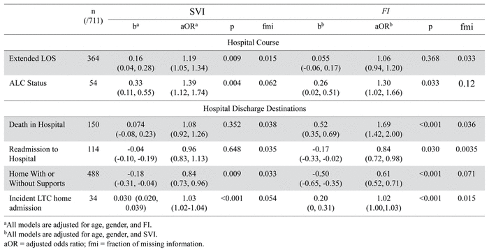 In 1,146 patients (mean age 80.5±8.3, 54.0% female), mean SVI was 0.40±0.16 and FI was 0.44±0.14. The SVI scores were not associated with admission to hospital. Amongst those admitted, for every 0.1 unit increase in SVI, LOS increased by 1.15 days (p<.001) after adjusting for age, sex and FI. SVI was associated with staying over the expected LOS (aOR: 1.19, 1.05–1.34, p=.009) and ALC status (aOR 1.39, 1.12–1.74, p<.004). SVI was not associated with in-hospital mortality, but was associated with incident discharge to LTC (aOR 1.03, 1.02–1.04, p<.001).
