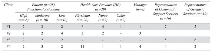 We recruited four primary care practices in the province of Quebec through our teams’ networks. In each practice, we recruited a convenience sample of HPs from any professions (e.g., nurses, social workers, physicians) who practiced there and the managers of the practices. We also recruited convenience samples of representatives of community-based support services, and of geriatric services near the practices. We also recruited six to eight patients who were a subsample of the 280 patients recruited as part of the broader project to assess the impact of the care pathway,(22) and who had varying levels of functional autonomy. Patients living with neurocognitive disorders were included in the study if they were accompanied by a caregiver who agreed to participate in the study and complete the questionnaires on behalf of the person for whom they were responsible.