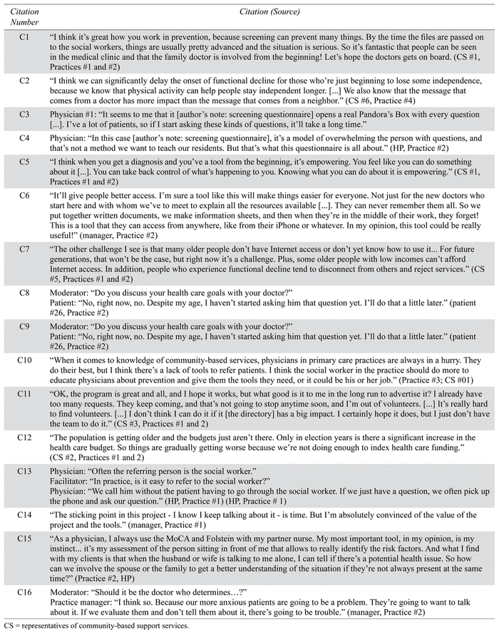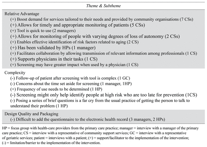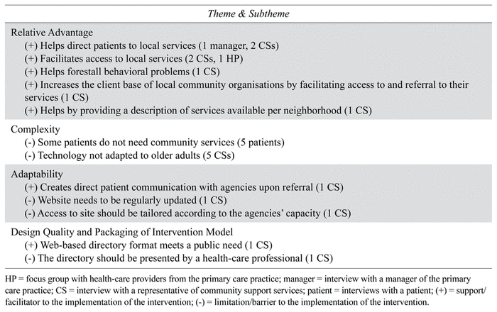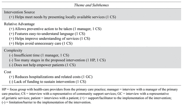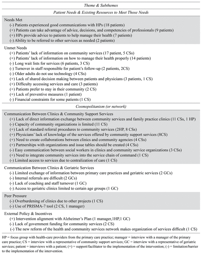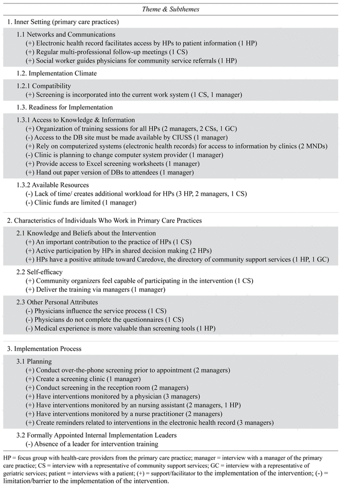 In this qualitative, descriptive study, we conducted semi-structured interviews and focus groups with patients aged 70 years and older, health professionals (HPs), and managers from four primary care practices in the province of Quebec, representatives of community-based services and geriatric clinics located near the practices. Two researchers conducted an inductive/deductive thematic analysis, by first drawing on the Consolidated Framework for Implementation Research and then adding emergent subthemes.
